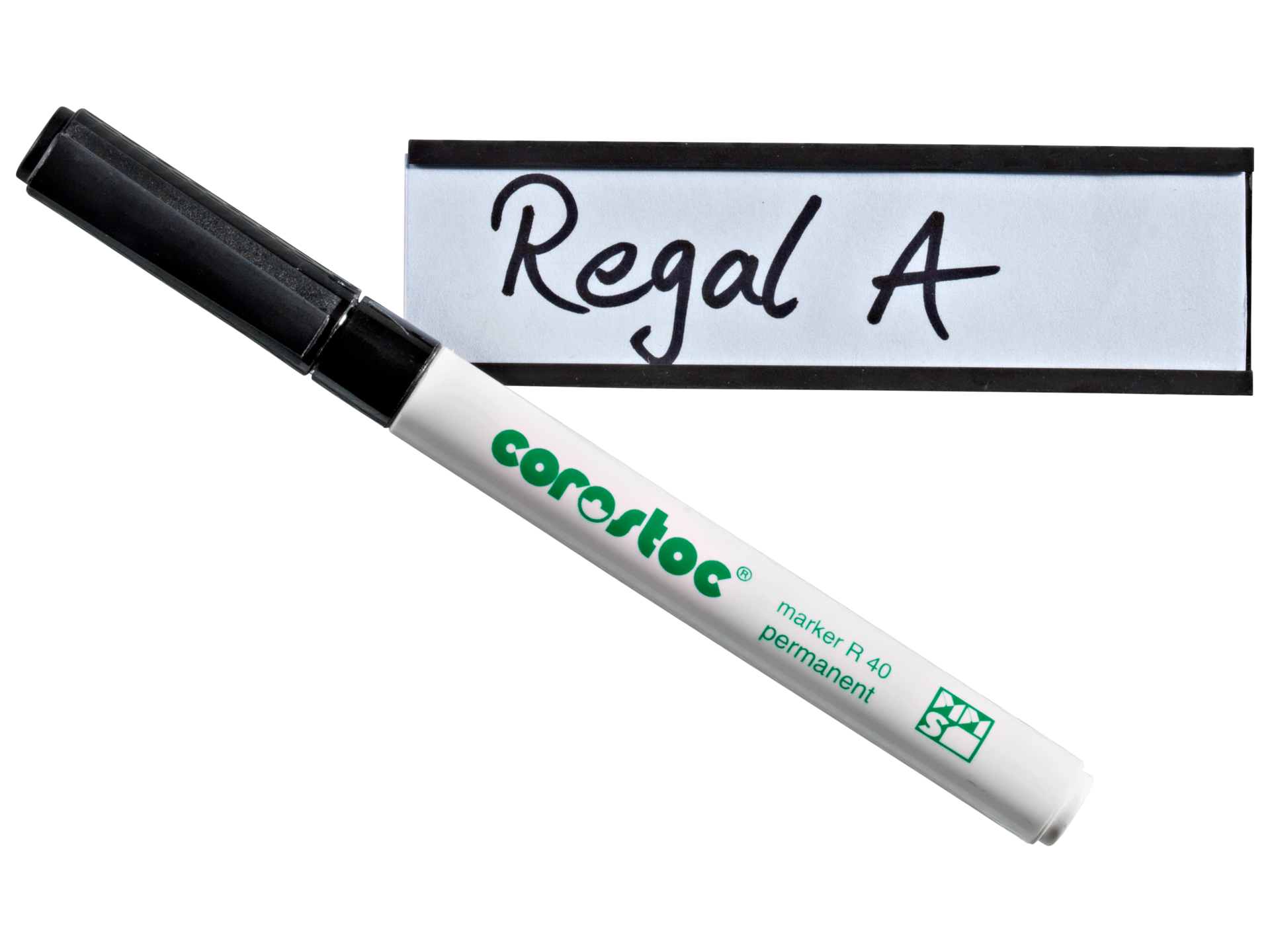 Die praktischen Einschubleisten für Etiketten haften durch ihre magnetische Rückseite auf eisenhaltigem Untergrund und ermöglichen ein einfaches Wechseln von Beschriftungsträgern. Ein passender Einschiebekarton und Transparentfolie sind im Lieferumfang enthalten.
